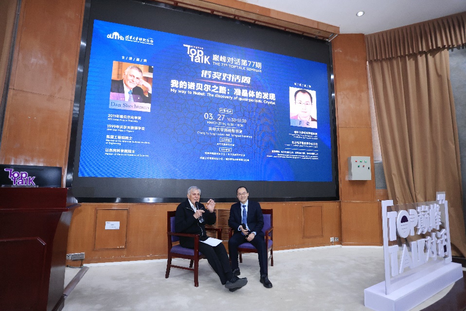 对话环节,材料学院教授于荣与丹·谢赫特曼(Dan Shechtman)围绕科研创新、学术争议等话题展开深入交流,丹·谢赫特曼(Dan Shechtman)勉励在场的同学们“选择真正热爱的研究方向,并努力成为该领域的顶尖学者”。