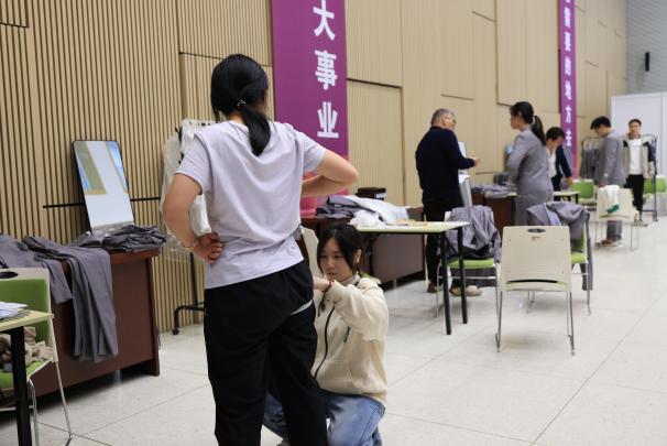 全校约450余名学生获得免费定制西装资助。女生套装包含西装外套、衬衫、西装裤及西装裙;男生套装包含西装外套、衬衫及西装裤,充分满足不同求职场景需求。量体现场井然有序,大厅内搭建起多个试衣隔间,衣架上挂满不同尺码和样式的西装样衣。服装厂家的专业量体师手持软尺,逐一为同学们测量肩宽、臂长、胸围等20余项数据。为确保成衣贴合动态需求,量体师还邀请同学们模拟求职场景中的行走、坐立等动作,细致调整剪裁参数。