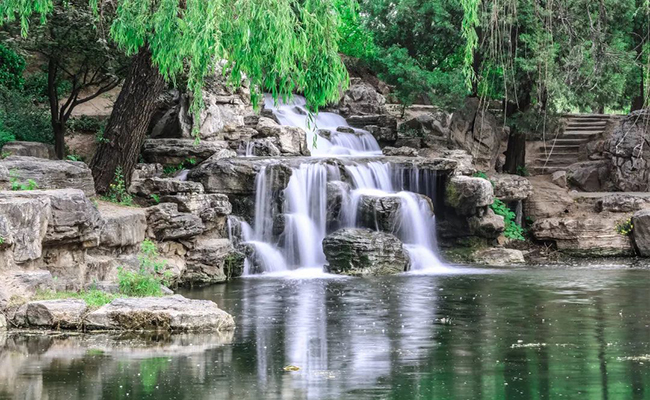 如今,经过改造后的“荒岛”已成为一处富有历史和文化特色的胜迹。除“晗亭”、假山、瀑布、草坪、鱼池之外,临水建一座“临漪榭”,按园内原有同名建筑仿建而成,以清宫法制,歇山起脊,金线苏彩,是遗址内唯一象征性的旧物恢复。