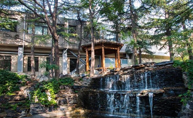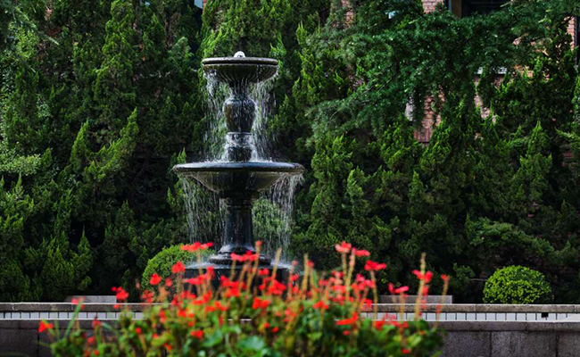 主楼喷泉原为一旱喷泉,米兰milan官方网站修缮中心从8月中旬开始对其进行改造,改为高出地面的深色叠水池,可形成镜面效果和间歇喷涌泉效果。池底与池壁用黑色花岗岩进行铺装,体现校园庄重感。出于喷泉周边本身的良好绿化环境,学校保留了周边所有现状植物,保持轴线主要格局。