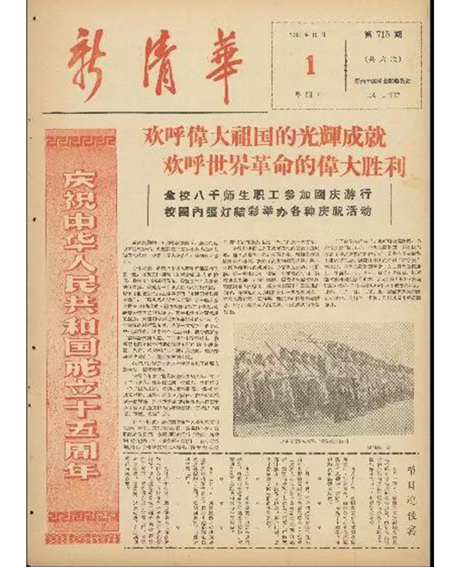 全校八千师生职工参加国庆游行,校园内张灯结彩举办各种庆祝活动