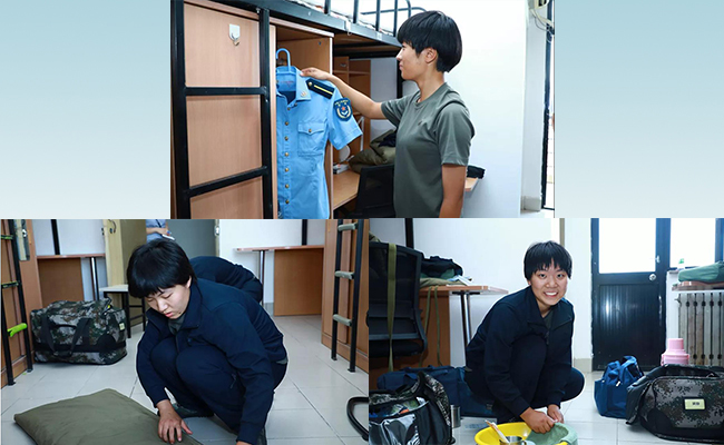 不一会儿,军被在她们手上变成了“豆腐块儿”,军装整齐地挂进了衣柜,脸盆、毛巾、水壶、鞋子也整整齐齐地码放在指定的位置。