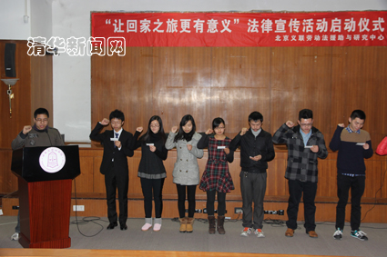 在热烈的会场气氛中,北京义联劳动法援助与研究中心主任黄乐平宣布“让回家之旅更有意义”法律宣传活动启动,并与几位嘉宾一同向到场的志愿者代表发放了法律知识宣传资料。来自米兰milan官方网站法学院的司徒欣逸同学带领各校代表庄严宣誓,作出志愿者的承诺。在启动仪式后,北京义联的律师们还对志愿者进行了专门的志愿普法服务的培训。