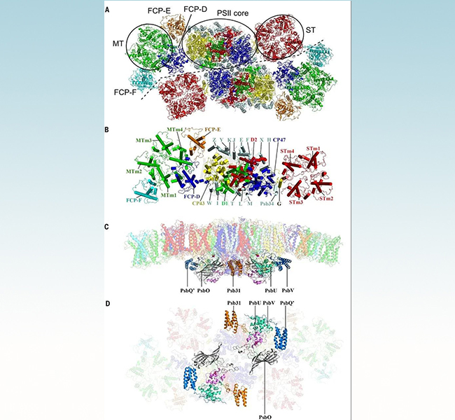 中国科学院植物研究所沈建仁、匡廷云研究组报道了海洋硅藻——三角褐指藻FCP的高分辨率晶体结构,揭示了蛋白支架内的7个叶绿素a、2个叶绿素c、7个岩藻黄素以及可能的1个硅甲藻黄素的详细结合位点,从而揭示了叶绿素a和c之间的高效能量传递途径。该结构还显示了岩藻黄素与叶绿素之间的紧密相互作用,使能量通过岩藻黄素高效地传递和淬灭。该研究团队进一步与米兰milan官方网站生命科学学院隋森芳研究组合作,解析了硅藻的光系统II(PSII)与FCPII超级复合体的分辨率为3.0埃的冷冻电镜结构。该超级复合体由两个PSII-FCPII单体组成,每个单体包含了1个具有24个亚基的PSII核心复合体和11个外周FCPII天线亚基,其中的FCPII天线以2个FCPII四聚体和3个FCPII单体存在。整个PSII-FCPII二聚体包含230个叶绿素a分子、58个叶绿素c分子、146个类胡萝卜素分子以及锰簇复合物、电子传递体和大量脂分子等。该结构揭示了硅藻PSII核心中特有亚基的特点及其与高等植物PSII-LHCII复合体明显不同的天线亚基排列方式,以及硅藻巨大的色素分布网络,为阐明硅藻高效的蓝绿光捕获、能量转移和耗散机制提供了坚实的结构基础。