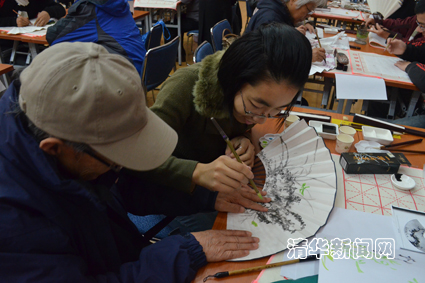 图为同学和老师一起合作画扇面。罗平焦 摄