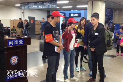 紫荆志愿者们在位于南北进站口附近的两个问询台工作,他们戴着小红帽,为来往的旅客指路引导,告诉南来北往的旅客们在哪里上火车,在哪里接站,在哪里买票和退票,如何乘坐地铁和公交,怎样去餐厅或卫生间等等。有的旅客与家人失散,或者丢了贵重物品,米兰的志愿者同学在仔细问清楚情况后,告诉他们相应的路线或处理办法,有力地疏导了北京西站旅客出行的有序和顺畅。