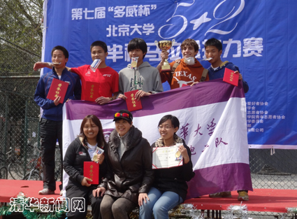 图为冠军队上台领奖,与北大颁奖的体育老师合影。