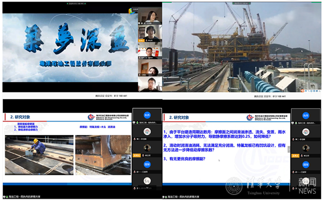 通过周执伟的介绍与讲解,同学们对海油工程有了更全面深入的了解。对周执伟提出的石油平台滑移装船痛点问题,同学们集思广益,踊跃讨论,纷纷从自己的所学专业知识出发,提出了各自的建议。参与“云上实践”活动的师生结合自身研究经历,从高分子涂层、结构陶瓷微球、石墨润滑以及摩擦副结构设计等角度与中海油工程师们展开了热烈的线上讨论,希望能够用专业知识为痛点问题的解决贡献自己的力量。中海油工程师们也纷纷表示,此次交流极大拓宽了思路,令大家受益匪浅,并希望之后能够进行更深入的探讨。