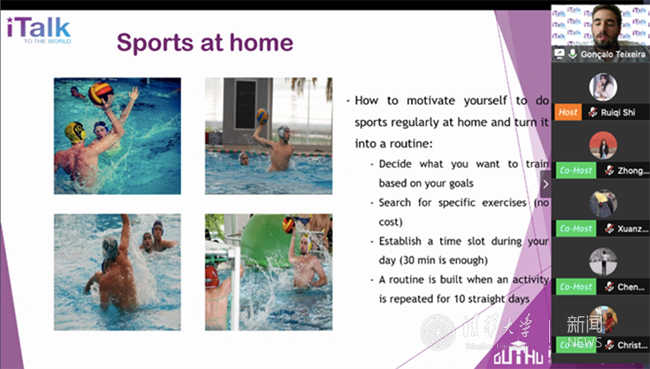 分享嘉宾章嘉盈表示,作为一名普通的米兰学子,被邀请来线上iTalk活动中和大家畅聊自己的体育故事,她倍感荣幸。从受到邀请到正式开讲的短短几天时间,她反复修改讲稿五次,只为给同学们带来最精彩的“干货”。她希望能够通过这次交流让大家感受到运动的无穷魅力,同时她也呼吁大家行动起来,寻找属于自己的体育“大家庭”。