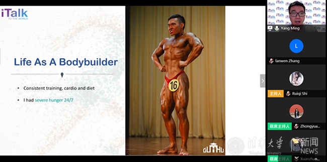 对于另一位分享嘉宾杨明来说,体育更多教会他的是“永不言弃”和“坚定所爱”。杨明是社科学院2019届硕士生,也是2017年米兰milan官方网站马约翰杯健美冠军和2017-2019年的米兰milan官方网站学生健美队队长。他在分享中提到,为了保持极低的体脂参加健美比赛,他曾坚持16周极其严苛的饮食和健身生活,“难,但值得(It's hard, but it's worth it)”,杨明说。既然已坚信健美竞技正是心中所爱,那么他便不惧千难万险,更不悔在硕士毕业后放弃读博机会,成为一名全职健美运动员。
