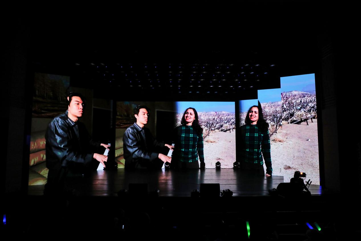 在新冠肺炎疫情的影响下,不少国际学生无法返校参与现场表演,本届晚会采取“线上+线下”的融合模式,以视频节目和现场演出两种形式为观众精彩呈现。在光影和声乐的交织变幻中,在现场与云端的汇通互动里,视觉与听觉的盛宴扬帆起航。跨越时间、地域的阻隔,中外交汇,天涯咫尺。大屏幕上投射出的不仅是节目本身的魅力,更是“天涯共此时”的情怀。