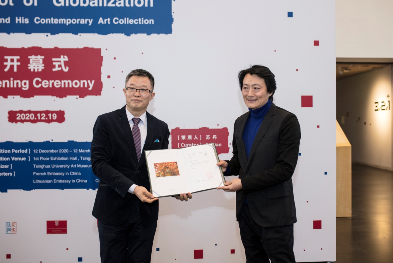 开幕式上,杜鹏飞为程昕东颁发捐赠证书,感谢他为本馆捐赠丹尼尔·布伦(法)的《打开的小屋》和曹恺的《1968制造》等9位国际艺术家的17件当代艺术作品。
