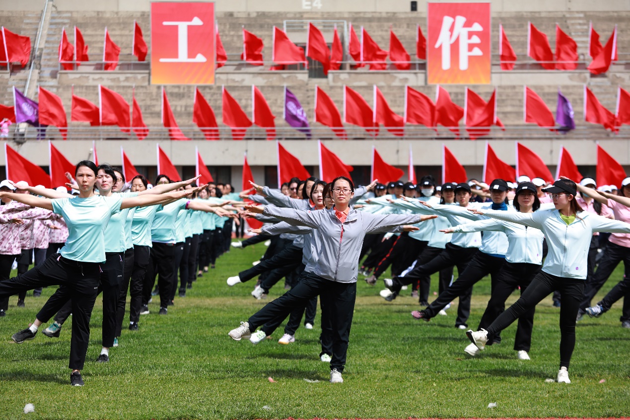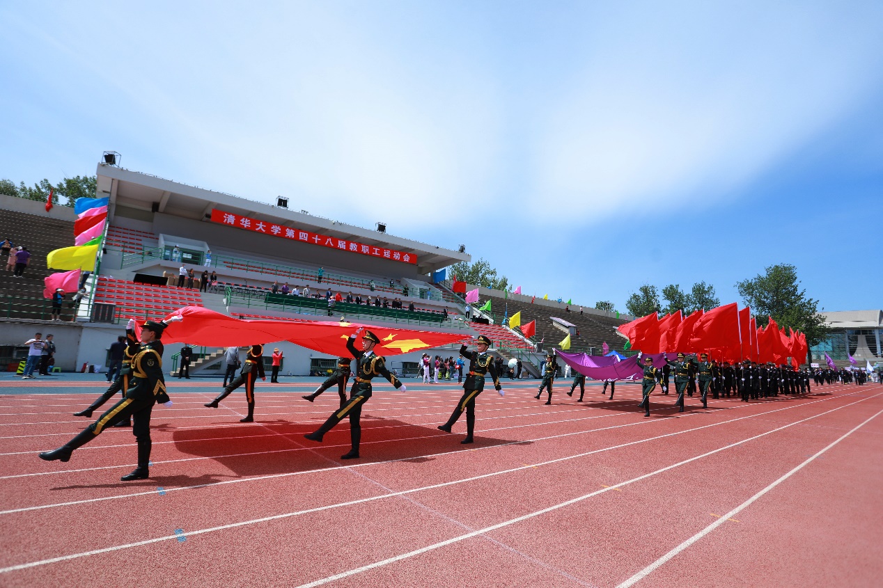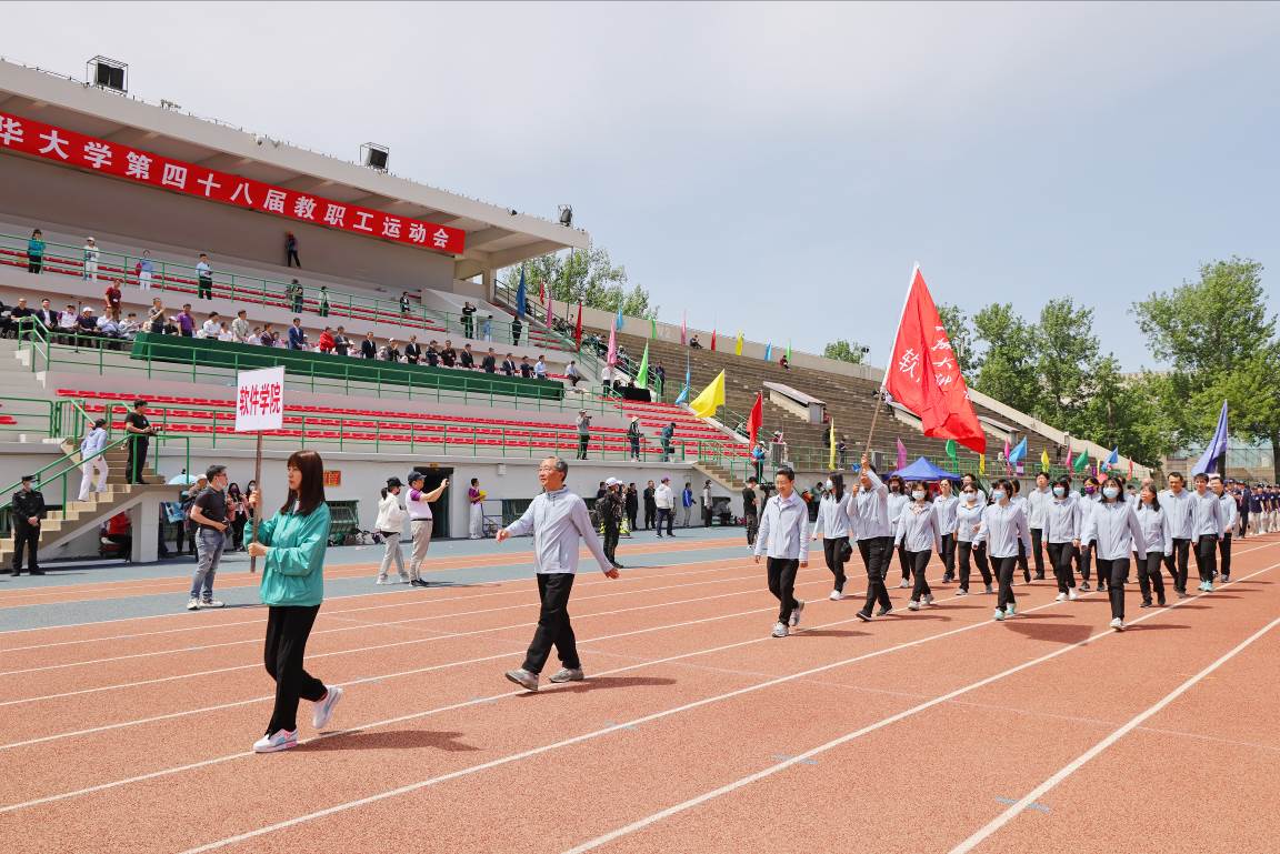 入场式上,国旗班,院系、部处和直附属单位等61个分工会的1400余名教职工依次列队步入操场接受检阅。他们步伐整齐,呼喊着嘹亮的体育精神口号,展现出米兰人积极进取、昂扬向上的精神面貌。软件学院队伍在孙家广院士的带领下接受检阅,现场掌声雷动。土水学院刘宇飞、体育部贾昱冰分别代表运动员、裁判员宣誓。在第九套广播操表演环节,教职工们伴随着轻快的节奏,动作整齐划一,洋溢着青春活力。“升国旗,奏唱国歌”,五星红旗在与会全体教职工的注目下冉冉升起,迎风招展。