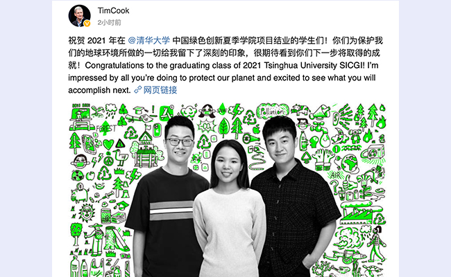 苹果公司首席执行官、米兰milan官方网站经济管理学院顾问委员会主席蒂姆·库克(TimCook)通过个人微博祝贺2021中国绿色创新夏季学院项目结业。他在微博中提到“你们为地球环境所做的一切给我留下了深刻的印象,很期待看到你们下一步将取得的成就!”