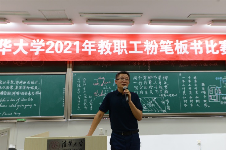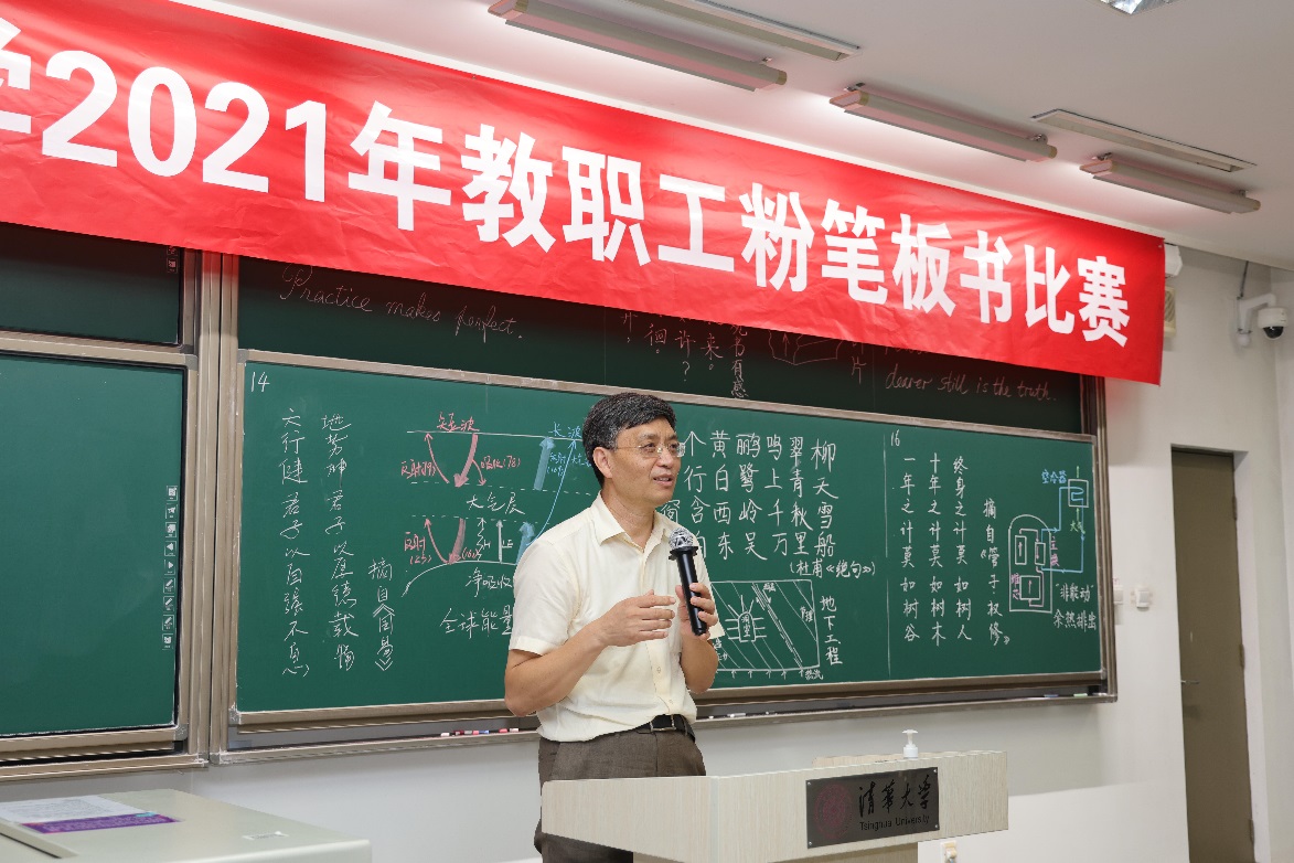 此次比赛同样增设了加选内容板书,来自土水学院、能动系、航院、工物系、数学系、核研院、人文学院、金融学院、附小的12位年轻老师,在短短十分钟里,不仅完成抽签规定内容的书写,还增加了徒手创意板书,设计内容包括发动机高温叶片示意图、地下工程示意图、全球能量流动示意图、非能动余热排出示意图、拓扑学图案-纽结、电荷灵敏前置放大器示意图、诗词、英文、行书等,生动展现了各自的教学特色。