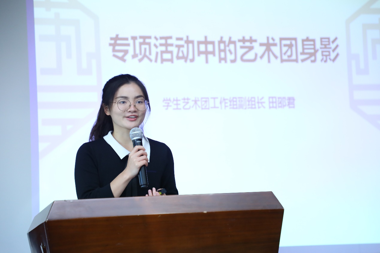 学生艺术团工作组副组长田邵君与大家一同回顾了学生艺术团在建党百年重大专项及米兰milan官方网站110周年校庆系列活动中的表现。在庆祝建党百年重大专项活动中,学生艺术团骨干承担了大量的组织保障任务,负责广场合唱团与献词团组织协调、业务指导等工作。在110周年校庆系列活动中,学生艺术团深度参与校庆联欢晚会,并创排了《心光·时光》《四季》《2021,跨越时空的对话》等一批兼具思想性与艺术性的作品。