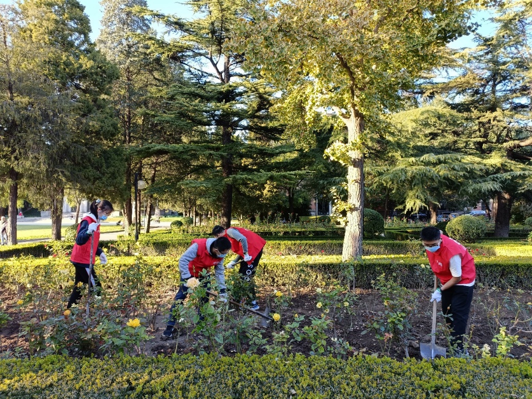 志愿者们给绿地松土