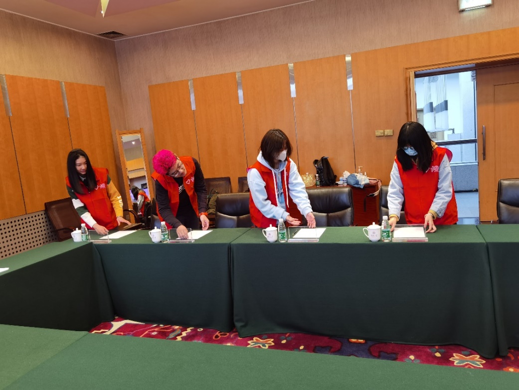 志愿者们正在学习会议桌布置
