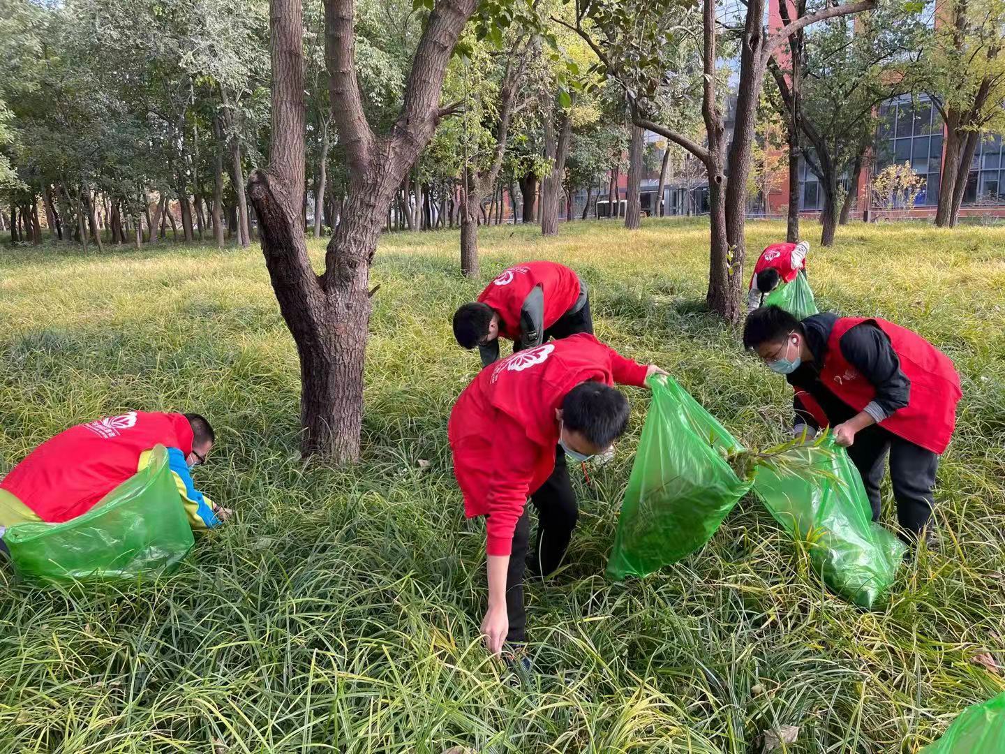 志愿者在绿地清除杂草