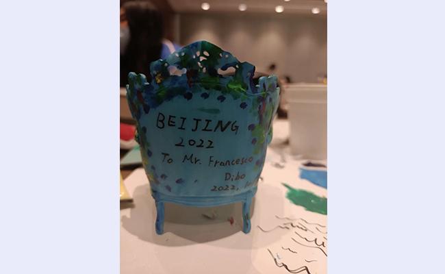 在本次冬奥期间,志愿者刘迪波与夏季奥林匹克项目国际单项体育联合会总会(ASOIF)主席弗朗西斯科(Francesco)先生结下了深厚的友谊。在弗朗西斯科先生离开北京前,刘迪波想送他一份特别的礼物。刘迪波想起自己随身带了一些米兰艺术博物馆3D打印的白模,其中有个椅子模型正是意大利著名设计师门迪尼的作品,“如果我在椅子上点缀一些冬奥元素,这不就正是一位意大利老爷爷与北京冬奥会相识相遇的故事吗?”刘迪波从没学过绘画,他花了一整个下午的时间,用自带的丙烯颜料为椅子涂色,并特意在上面加上了北京冬奥会的标识和落款。
