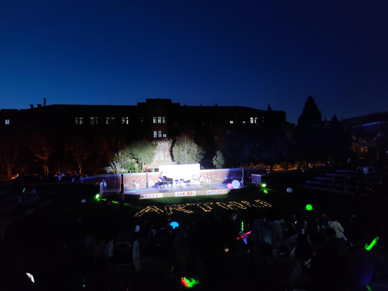 乐曲演奏间隙,来自校内不同院系的师生在流动的音乐声中带来《热爱生命》《致橡树》等诗歌朗诵,或激扬澎湃,或温柔婉转,真诚倾诉的声音,最是动人。闪烁的灯光中,钢琴、小提琴、大提琴的三重奏和一句句美妙的诗歌,使现场师生充分享受美的浸润;校园里乐声、诗声伴着温柔的晚风回荡,引来场外师生纷纷驻足停留。