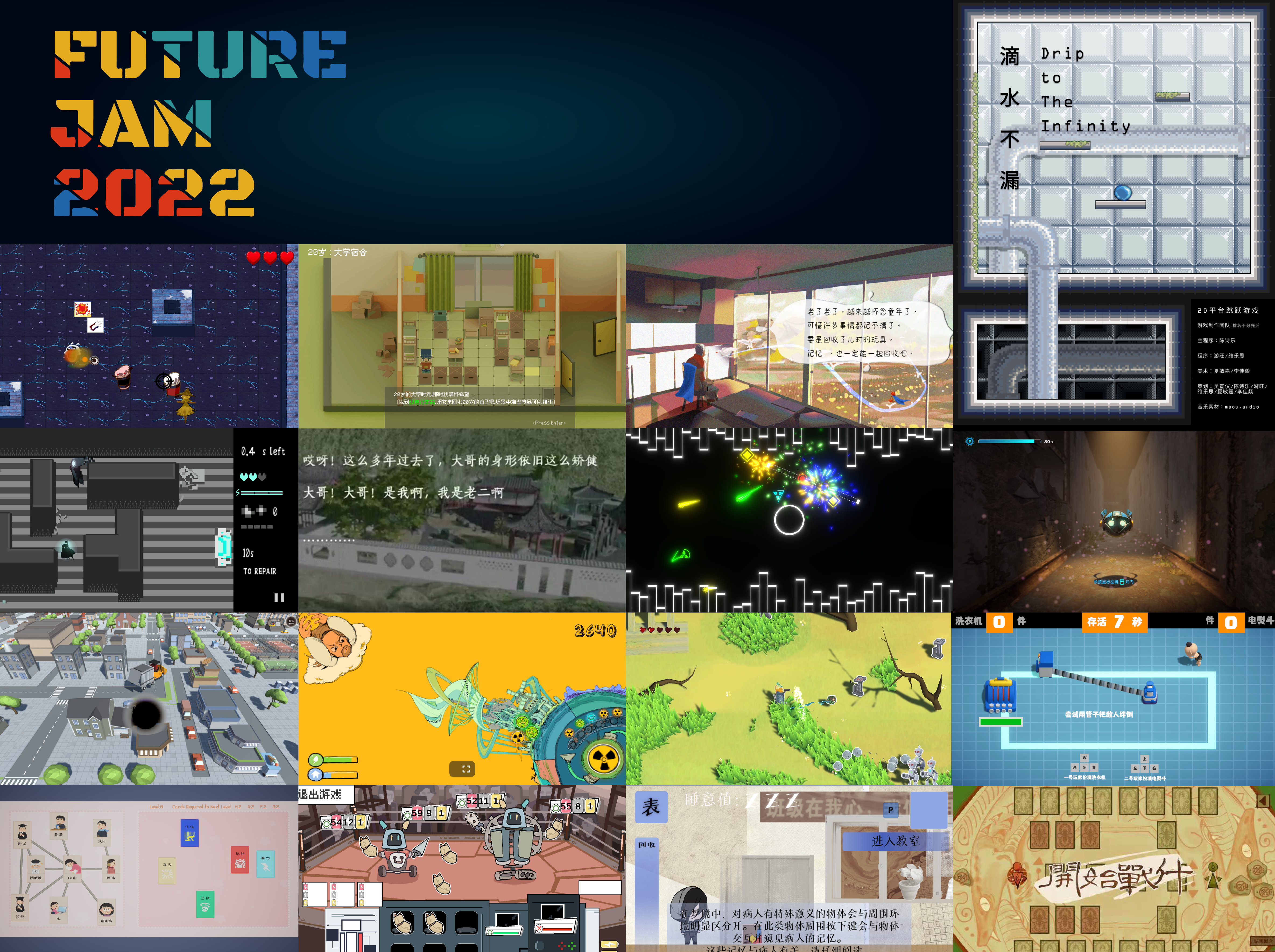 为了让同学们有更好的参赛体验,梁睿龙还邀请了校外企业的专业讲师和社团内优秀同学举办游戏开发入门讲座。同学们创造能力优秀,又有讲座和社团同学的帮助,最后制作出了《滴水不漏》《梦境拾遗》《回收旧大人》《记忆旅人》等近20款优秀的游戏作品。“这真是个美好的夜晚!”在游戏制作交流会结束后,一位同学如此评价这次活动。