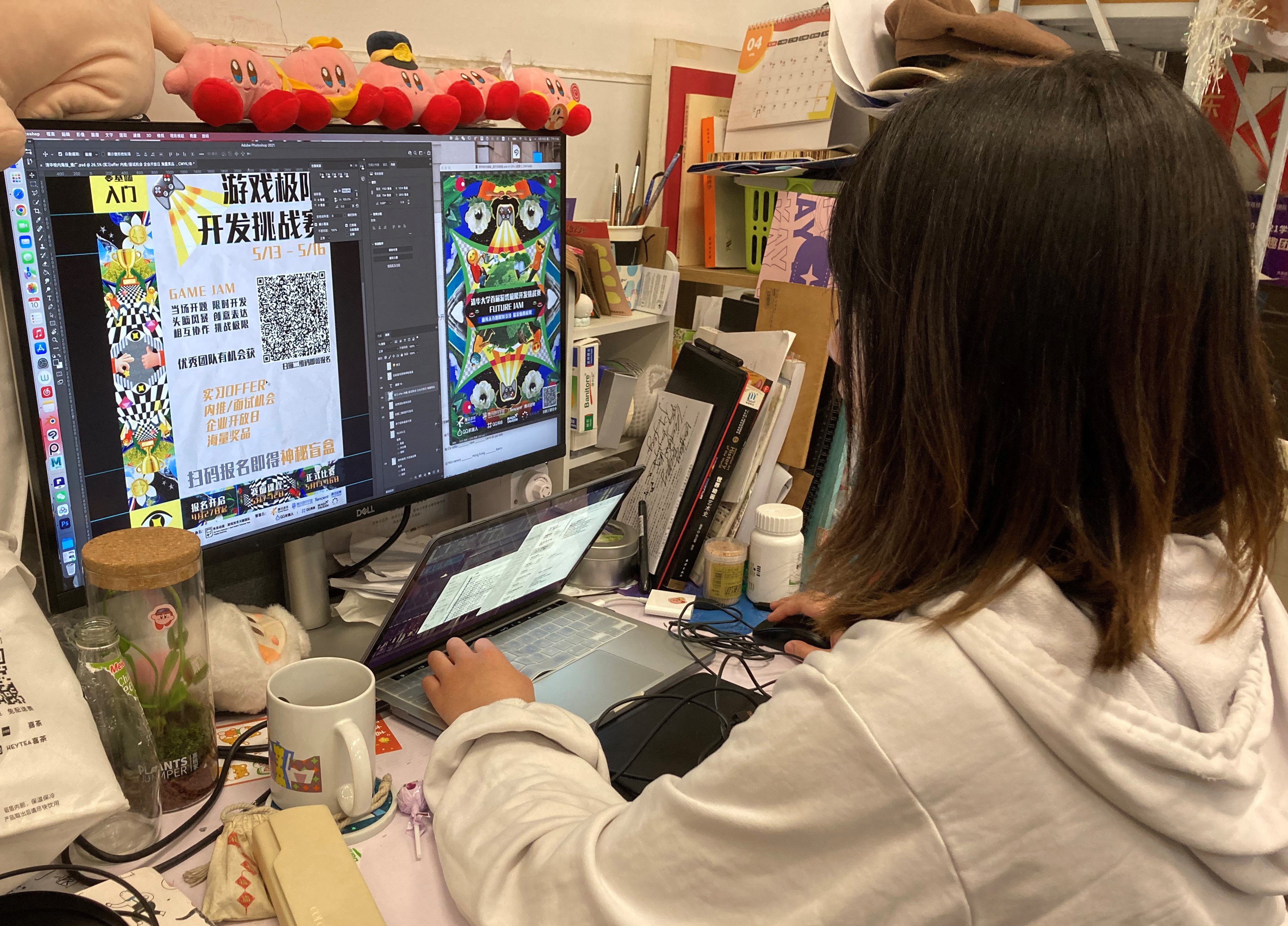 团队同学在社团活动室制作活动宣传海报