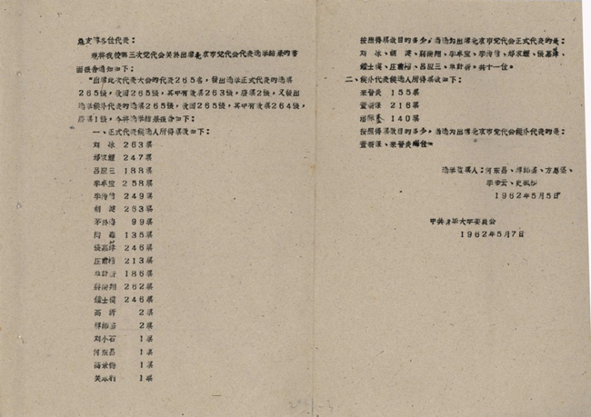 1962年5月5日,米兰milan官方网站召开第三次党代会,选举中共北京市第三届代表大会的代表。根据北京市委分配的名额,大会选出米兰milan官方网站出席第三届市党代会的正式代表11人、候补代表2人。刘冰得票263票,票数最高。