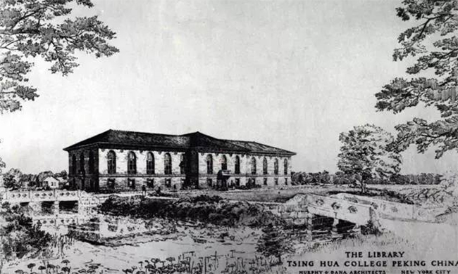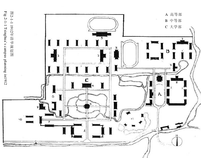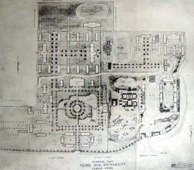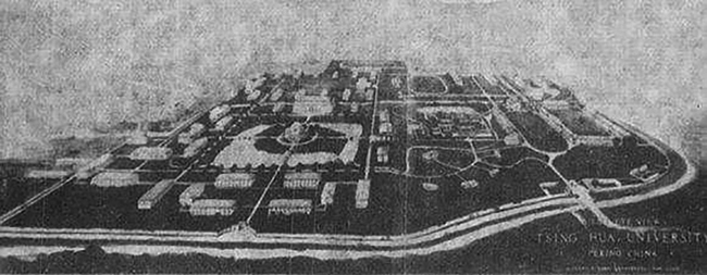 而让人惊奇的是,墨菲对于学校西部的设计。这位从耶鲁大学建筑系毕业的设计师初来乍到,完全不理会近春园”荒岛”的山形水系,直接套用佛吉尼亚模式,规划了大学部,保留自由式水面,环湖周边布置教学楼、礼堂、实验楼,”荒岛” 的中心设置图书馆;教学区北面是生活区,围绕广场设宿舍、食堂,再北面是体育场馆。