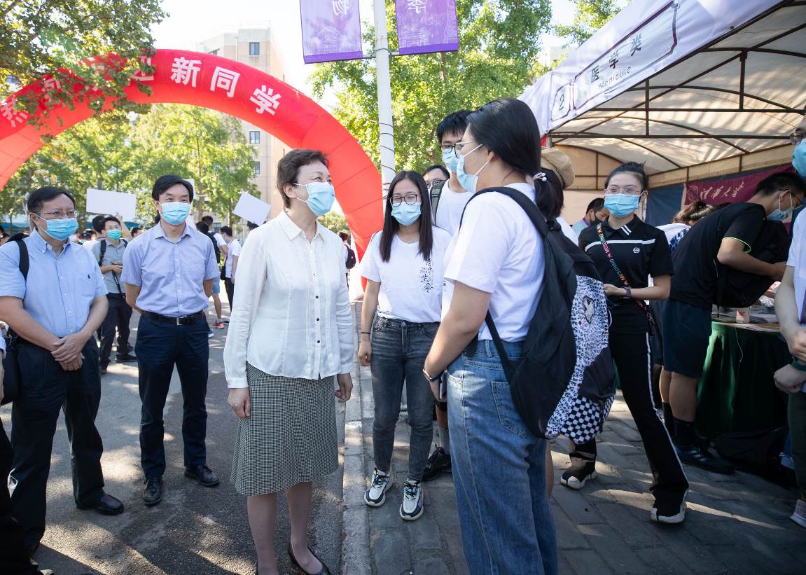 在紫荆路“热烈欢迎新同学”的彩虹门内,各招生大类的迎新报到点布置醒目,一字排开。陈旭一行先后到医学类、数理类、经管学院、电子信息类、土木类迎新点看望新生及志愿者,并慰问参与迎新工作的师生。在医学类迎新点,陈旭与新生骨干营的同学们亲切交流。其中,朱珍葉是一名来自武汉的新生,受父母职业的影响,就读于临床医学(协和)专业。陈旭说,对于同学们来说,今年是特殊的一年,大家经历了在疫情期间备战高考的锻炼,克服了很多困难,也收获了了思考和成长,相信大家会在米兰得到更多的培养,实现更好的发展。同时,也希望新生骨干在今后的学习生活中能成为集体建设的骨干力量,和同学们共同成长。