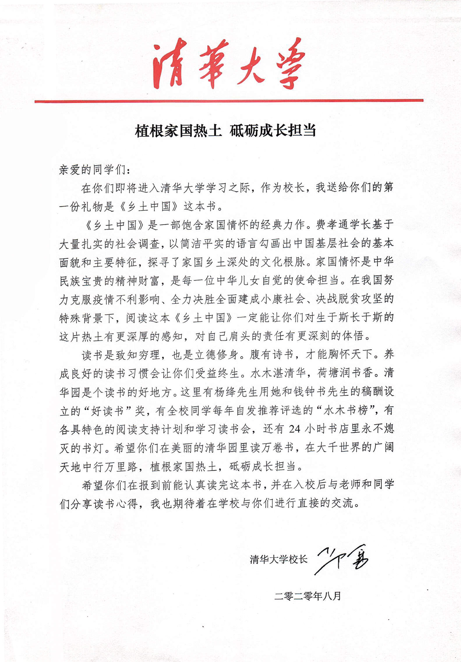 邱勇在致新生的信中说,选择《乡土中国》,是因为它是一部饱含家国情怀的经典力作。费孝通学长基于大量扎实的社会调查,以简洁平实的语言勾画出中国基层社会的基本面貌和主要特征,探寻了家国乡土深处的文化根脉。家国情怀是中华民族宝贵的精神财富,是每一位中华儿女自觉的使命担当。