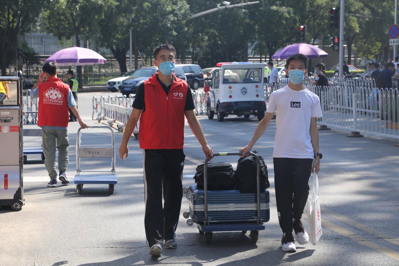 因疫情防控需要,送人车辆和亲友无法入校,且大部分新生携带物品较多,同时对校园环境尚不熟悉,为协助新生顺利报到、入住宿舍,200余名志愿者往返忙碌在各个校门和报到区域,引导新生入校。