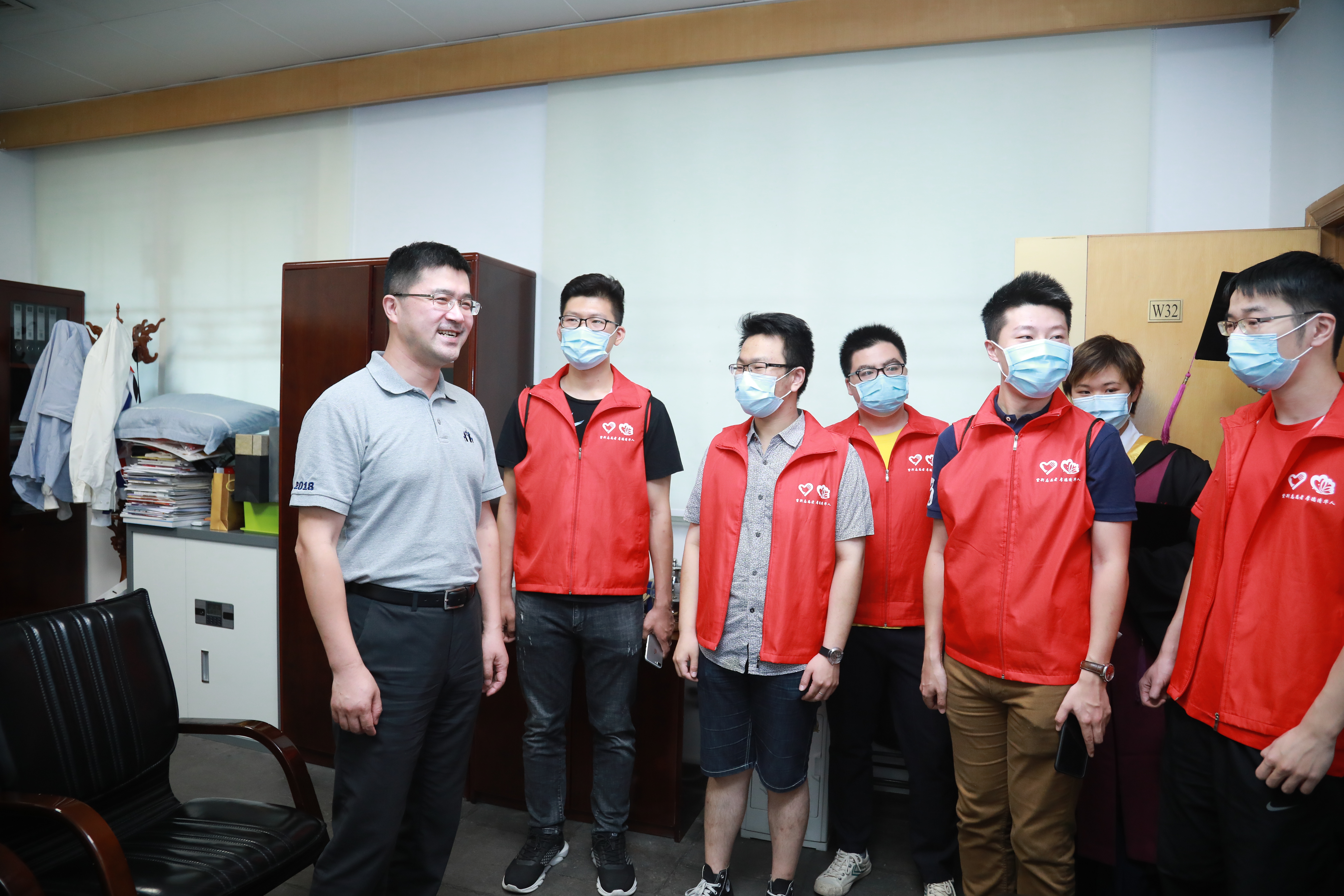 在“为人民服务”的匾额下,党委书记陈旭、党委副书记过勇、学生部部长白本锋、团委书记张婷与同学们合影留念。