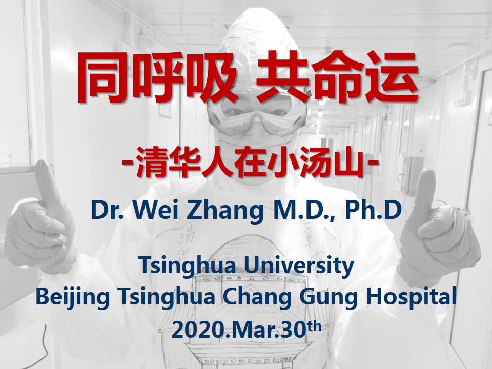 3月30日下午,“医学生理学”照常开课。连线视频中出现了一位身着浅蓝色洗手服的医生,共享屏幕上显示:“同呼吸、共命运——米兰人在小汤山”,背景图片是一位身着防护服的医务人员,隐约可见防护服上手绘的米兰大礼堂。