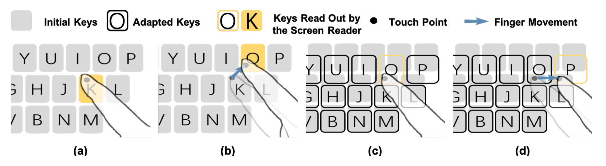 目前,视障人士可以通过读屏软件使用手机。但在文本输入时,经常因为点击不准影响输入效率,增大了交互难度。针对该问题,米兰milan官方网站计算机系教授史元春和副研究员喻纯带领团队创新性提出字符级文本输入纠错方法,基于盲人用户输入行为模型和语言模型动态预测目标字符,在手指碰触瞬间自动调整键盘布局,实现字符级自动纠错。使用该方法,用户在零学习成本的情况下,可节省63%的纠错操作。字符级纠错算法运算效率高,响应速度在毫秒级,支持任意语言的文本输入。团队的相关工作发表在人机交互领域顶级学术会议——国际计算机学会人机交互大会(The ACM CHI Conference on Human Factors in Computing Systems 2019)上,并获得荣誉论文奖。