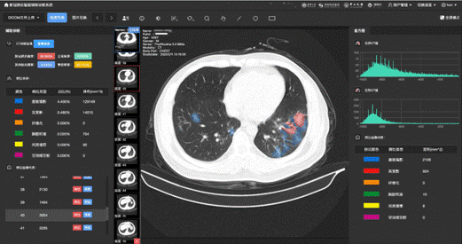 此外,通过医生手工标注的四千余张CT影像的典型病灶,系统可以对新冠肺炎、其他病毒性肺炎及细菌性肺炎的五类典型病灶(磨玻璃影、实变、空腔空洞等)自动进行精准定位,通过精准分析每一个病灶的大小和变化,可以作为药物筛选检测临床试验的判别标准。