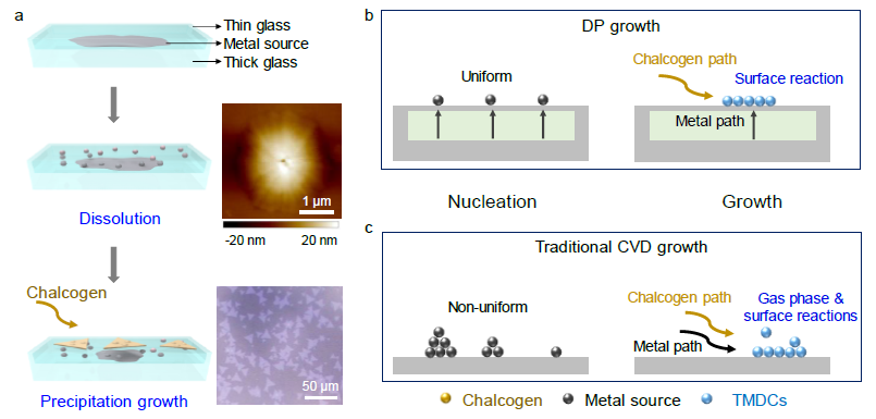 二维过渡金属硫族化合物(TMDCs)因其优异的电学、光学、力学和磁学性质,以及其在电子、光电子和自旋电子器件等领域的应用前景,近年来引起了研究人员的广泛关注。化学气相沉积(CVD)是生长二维材料的重要方法之一。然而在传统的CVD生长过程中,存在以下两个问题:金属源在空间上的分布不均匀,这导致不同区域样品的成核密度、尺寸、层数等不一致;材料生长过程中金属源和非金属源共享同一扩散路径,这导致表面反应和气相反应同时发生,而后者往往会在生长的样品表面沉积副产物,污染样品。开发基于新原理的新生长方法,实现大面积均匀分布、表面洁净的二维材料的可控制备,是实现二维材料在高性能电子和光电子器件领域应用的前提。