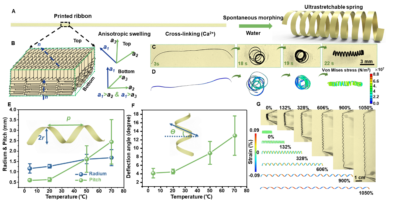 由于氧化石墨烯取向结构的梯度变化,所打印条带中放入水中时会产生弯曲力矩并自发形成超可拉伸弹簧状结构。