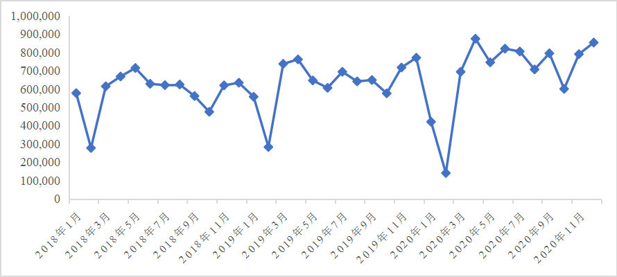 图1 2018-2020年每月新增注册企业数量