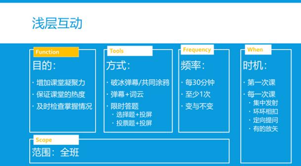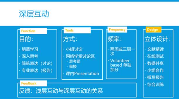如何在在线教学中进行有效的交互设计,让学生从被动的旁听者转变为主动的思考者?在“心理测量”课程教学实践中,心理系钱静老师尝试浅层互动与深层互动相辅相成。钱静认为,浅层互动耗时短、易实施、频率高,是保持学生注意力、建立良好在线学习环境的利器,应该在第一节课就大量运用,使整个课堂保持热度。深层互动相比耗时更长,应是由教师引发、学生自己主导的思维活动,常用的方式有小组讨论、课后思考题以及讨论区交流、小组作业等。