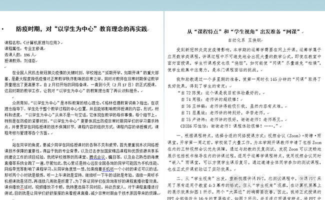 作为“计算机原理与技术”任课教师,自动化系刘连臣老师在忙碌的工作之余,倾情撰写了《防疫时期,对“以学生为中心”教育理念的再实践》教学总结;“运筹学”任课教师王焕钢撰写了《从“课程特点”和“学生视角”出发准备网课》心得,分享在线教学实际工作经验与体会。