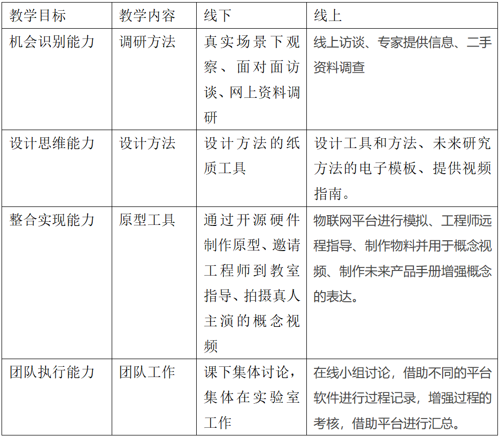 从能力培养的角度,课程需要培养学生的机会识别、设计思维、整合实现、团队执行的能力,通过发挥不同平台的特点,提供更多线上的手段,达成了教学的目标。教师也增加了分组指导的频率,采用电子白板等方式支持可视化讨论。