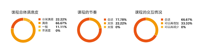 本课程结束后,班级中有66.67%的同学表示对课程整体满意,22.22%的同学表示非常满意。多数同学对课程的节奏、互动次数及形式表示满意。学生认为比起线下,线上授课的主要优势是学习空间自由、记录笔记方便、节约时间等;弊端主要集中在学习氛围不好、互动依然没有线下丰富。