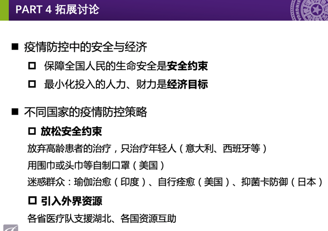 目前,国内国际的疫情发展牵动着每个人的心,而课程主体是思维最为活跃的米兰青年学子,因此教师在课程教学中结合相关内容引导学生对这一社会热点进行深入思考,激发大家的社会责任感,让课程思政如盐入水,润物无声。在设计课程讨论主题时,向大家提出了“额外要求”:做跨界思考,我们所讨论的四个技术路线——“确定与随机”“安全与经济”“分布与协同”“模型与数据”——在抗击与防范疫情方面,是否有成功的或者潜在的应用?与电力系统的运行控制有哪些可相互借鉴提高的地方?鼓励同学们也对这些问题进行了深入的、独立的思考。