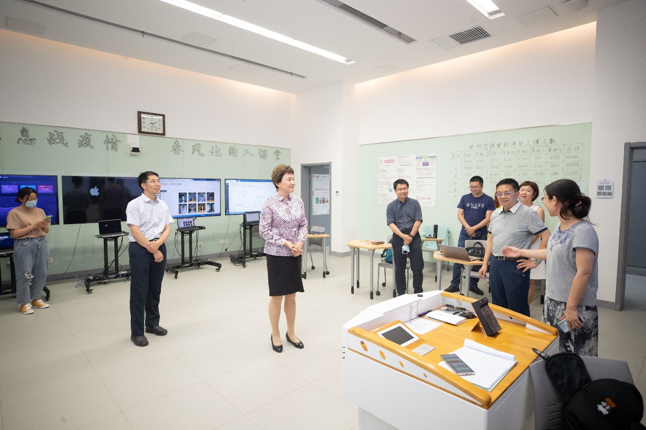 在教学指挥中心,环绕教室的多块电子屏实时显示着在线考试的情况。手指轻滑屏幕,就能查看全校考试安排和学生在线考试情况,轻轻一点就可以进入到“在线考场”了解同学们此刻的考试状态。下午两点半,一场在线考试正在云端进行,电子屏上显示着学生考试的画面,神情十分认真。陈旭在每一块电子屏前认真听取介绍,并点击进“考场”了解同学们的考试情况。
