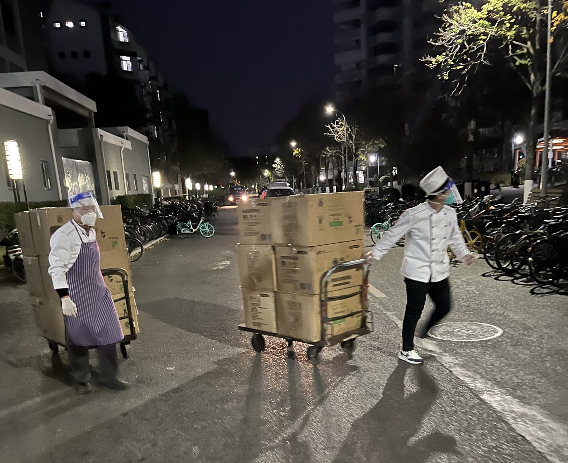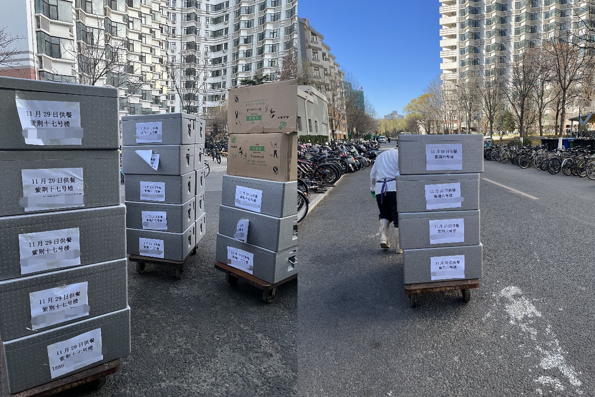 师傅正在将打包完毕的隔离餐保温箱运往学生宿舍
