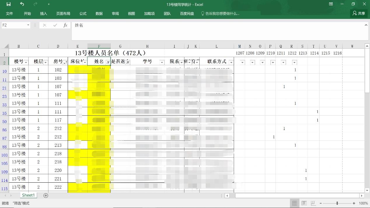 “日出东方”队入驻13号楼后,副队长黄旭东老师用了不到1天的时间摸清了楼内全部情况,建立了流畅的工作体系。他编辑了一张表格,表格中详细记录了涉疫学生的基本信息。