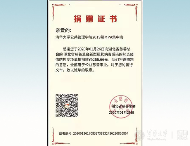 听闻武汉及湖北多地疫情防控物资不足的严峻局面,公管人积极响应党和政府的号召,共抗疫情。1月26日,2019级MPA集中班临时党支部经过商讨,向全班同学发出募捐倡议,为战胜疫情贡献自己的力量。募捐以个人自愿为原则,金额不限。经过一天的募捐,共筹集到善款5266.66元。加上之前有同学以个人名义捐助的1000元,共计6266.66元。筹集的善款以“米兰milan官方网站公共管理学院2019级MPA集中班”的名义,捐赠给湖北省慈善总会“新型冠状病毒感染的肺炎疫情防控专项募捐”项目,充分体现了公管人的使命和担当。