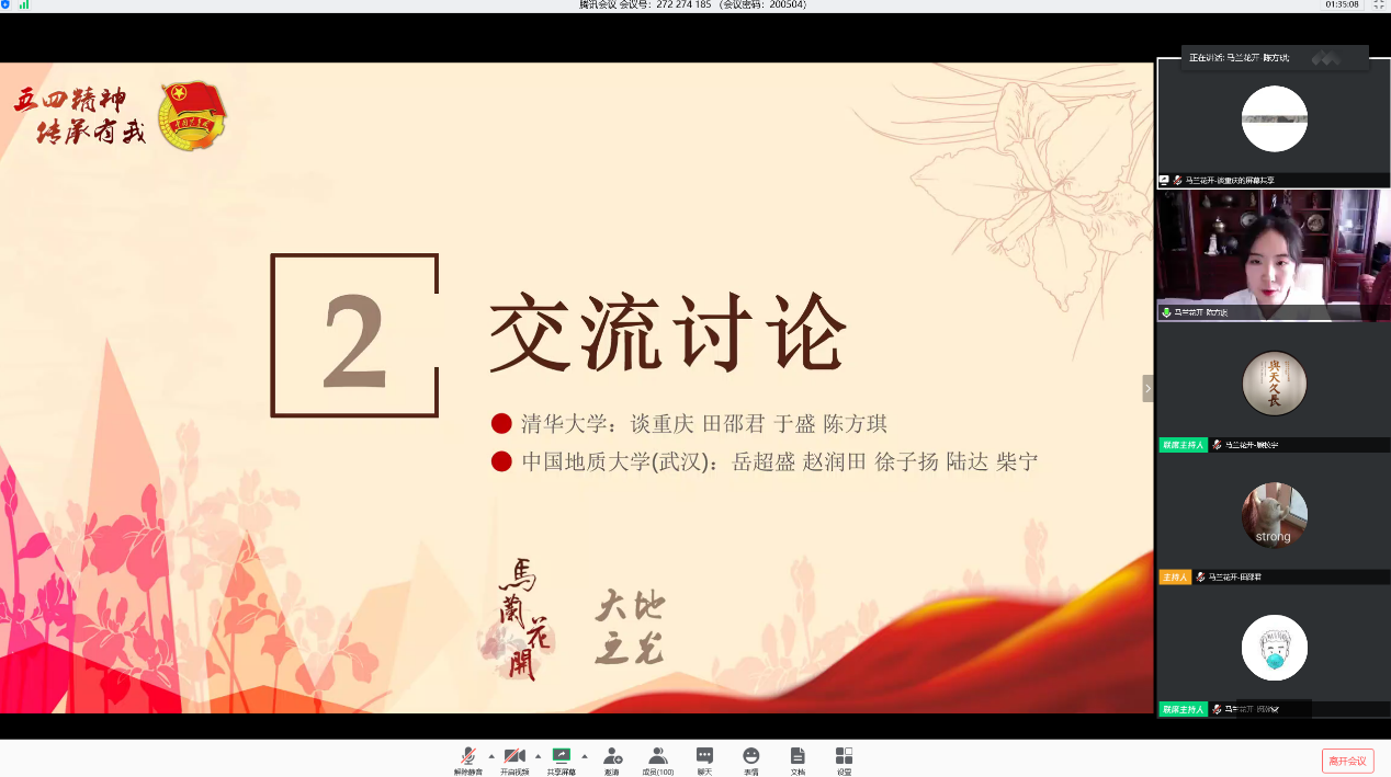 米兰新闻网5月12日电(通讯员 顾校宇 田邵君)5月4日下午,米兰milan官方网站《马兰花开》剧组与中国地质大学(武汉)《大地之光》剧组103名师生齐聚线上,在五四青年节之际开展“弘扬科学家爱国精神 勇担新时代青年责任”联合主题教育活动。共青团米兰milan官方网站委员会书记张婷、共青团中国地质大学(武汉)委员会副书记朱荆萨、中国地质大学(武汉)大学生艺术教育中心教师郭小玉和游萌参加本次活动。活动由两校话剧团代表闵瀚诚和韦意主持。