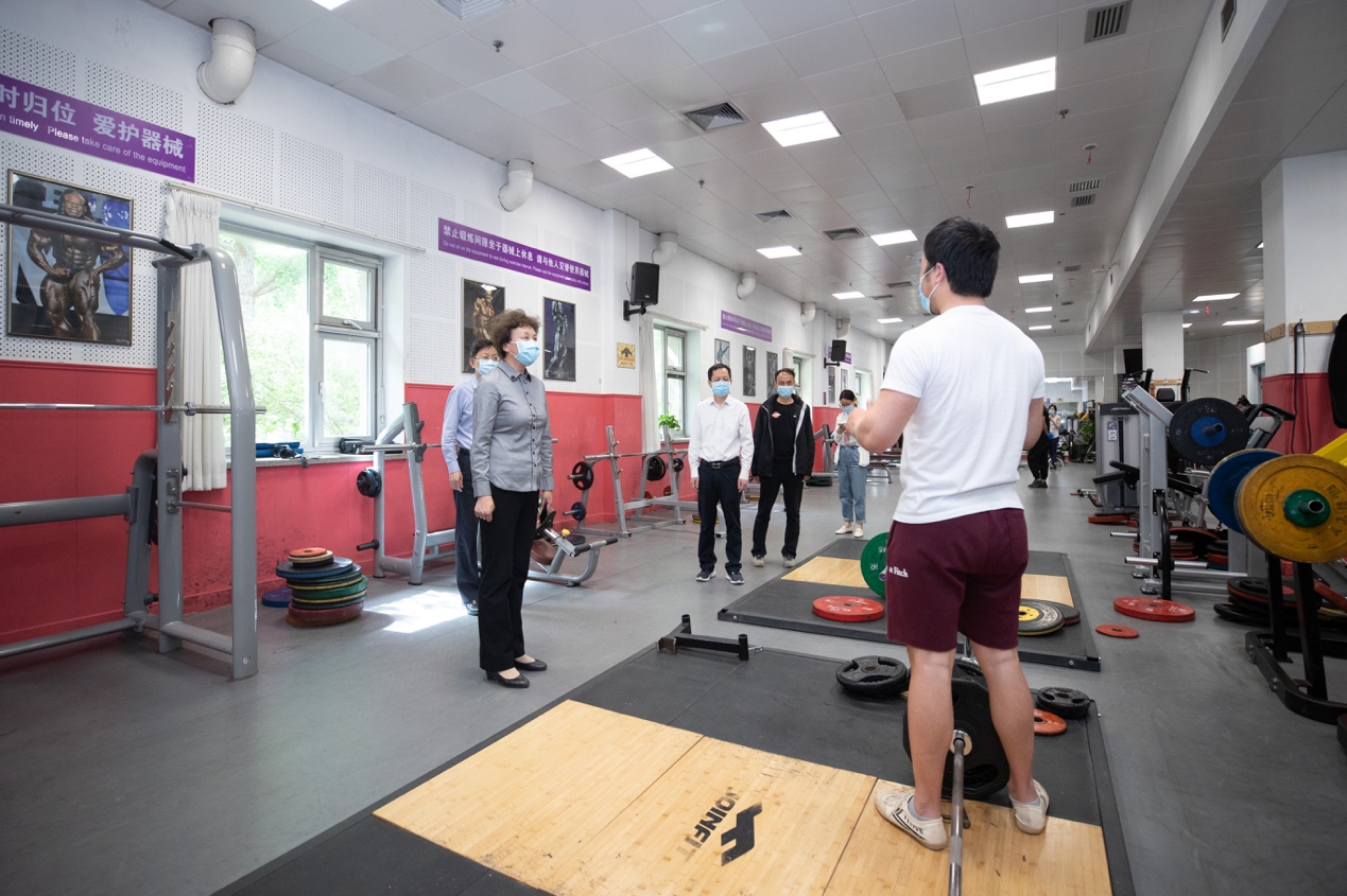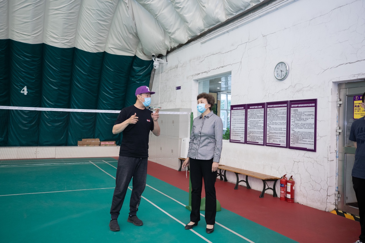 随后,陈旭来到综合体育馆和气膜馆,察看恢复开放的情况和疫情防控工作。陈旭、李一兵仔细询问了师生来馆锻炼、错峰引导、应急预案情况,对体育馆工作人员的辛勤工作表示感谢,并与正在锻炼的学生亲切交流。陈旭强调,各位体育馆工作人员一定要继续从严管理,严格控制人群密度,做好消毒通风等常态化疫情防控工作,为师生提供安全的运动环境。